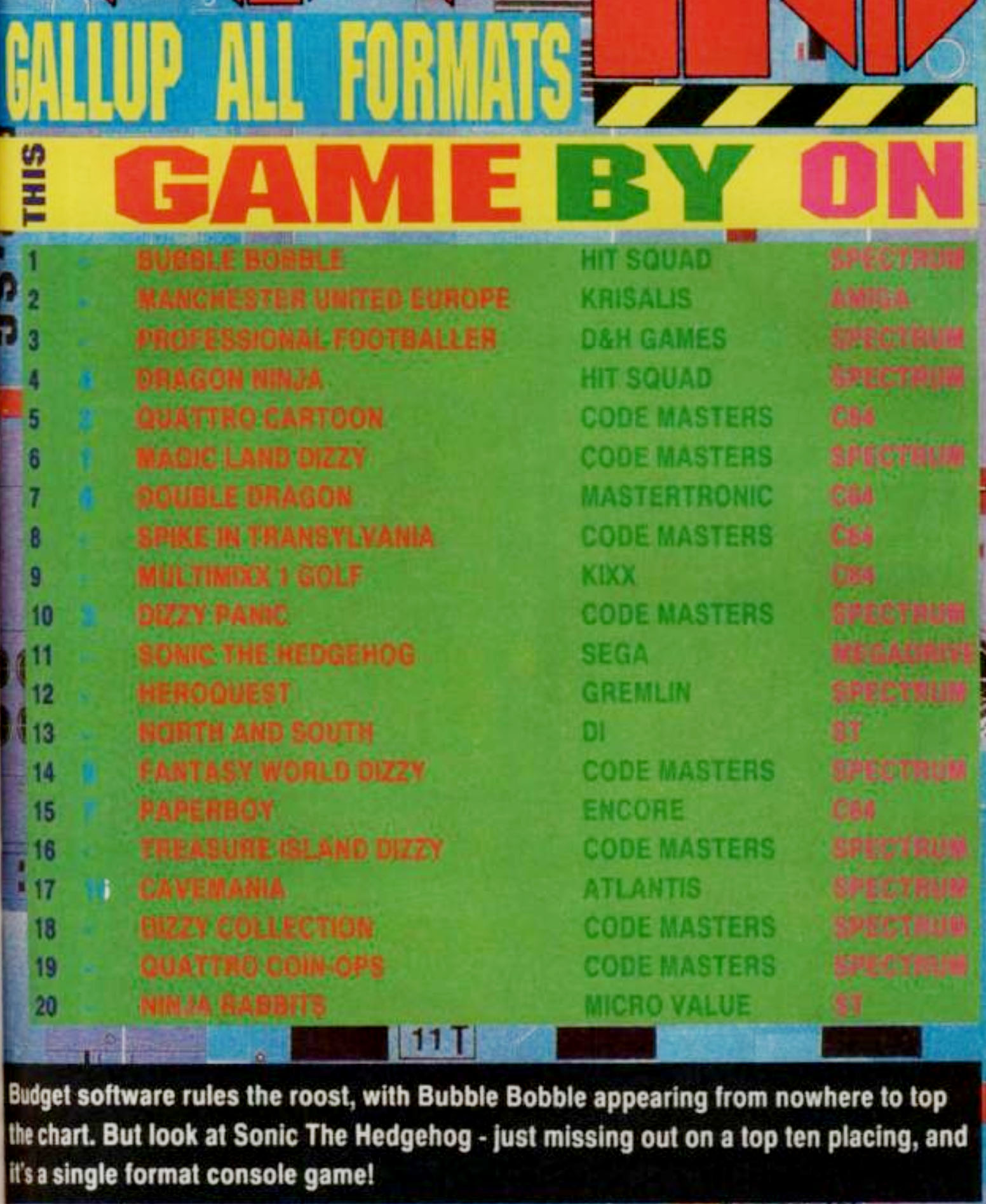 Appearing in the summer of 1991, Sonic was Perhaps the first “must-have” console-only game in the UK, attracting the money of pretty much every existing Mega Drive owner in the land while single handedly shifting a whole load of new console sales to boot. Though it consequently shot straight to the top of the Sega chart, it reached just number 13 in the all formats chart, outsold by the likes of the Spectrum port of Bubble Bobble and shape-sorting Dizzy spin off “Dizzy Panic”. Crucially, this fact wasn’t seen as an abject humiliation – on the contrary, a chart placement of 13 was actually seen as a major achievement for a single-format console game.