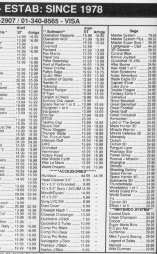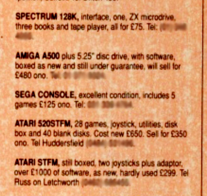 While it’s true that magazines carried more Sega classified ads than they did Nintendo, for example, the total number of console adverts they carried were few. Six Sega classified adverts may have been impressive against one single Nintendo ads, but neither number seems impressive when we consider that there were 95 other adverts for Zx Spectrums, C64s, Atari STS and Amigas.