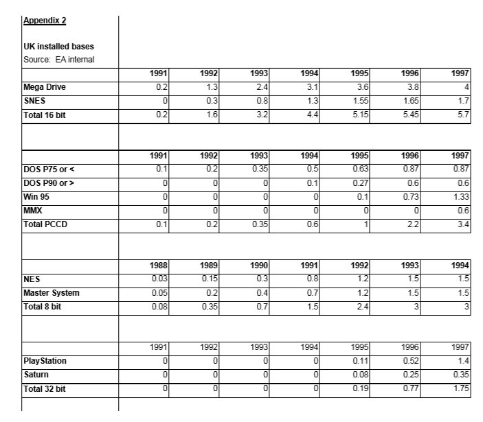 After a bit of digging, I stumbled across some data in an old Neo Gaf thread that claimed to be an annual breakdown of console install bases taken from internal research conducted by Electronic Arts. Providing breakdowns of 8- bit install bases from 1988 onwards, it tells a different – but somewhat complementary – story. Though the EA document agrees that both 8 bit consoles had an install base of 1.5 million by the end of 1993, the longer story is one of the Nintendo machine playing catch up: the Master System accounted for 5/8 of all 8-bit console sales in 1988, and maintained a healthy lead until at least 1991.