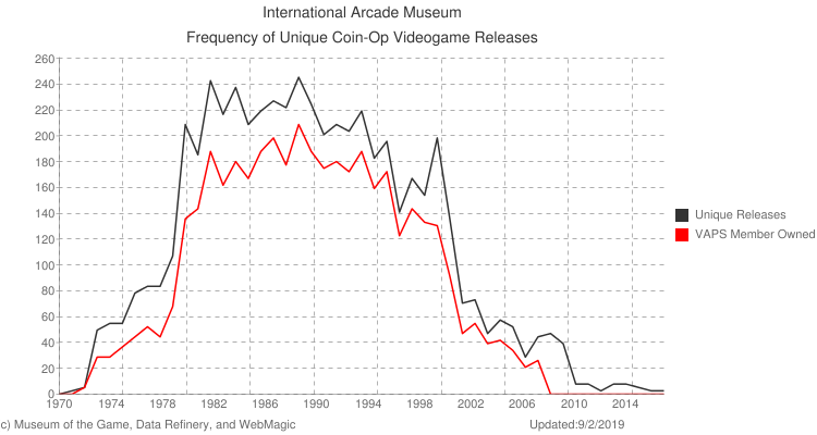 We can say that Larry is definitely wrong on a couple of the minor details. Difficulty dip switches were almost as old as coin-op video arcade games themselves (as we can see from the dip switch arrangements for Pacman, Space Invaders, Rally-X, Frogger, and Donkey Kong) so were definitely a well utilised phenomenon by 1982. It’s also wrong to say that the incoming crash depressed the number of games produced. There may have been peaks and troughs from year to year, but according to this handy graph produced by the international arcade museum, the overall frequency of releases between 1982-6 remained higher than the number of titles released in 1980.