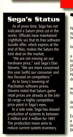 By the end of the year Sega had potentially boosted Saturn sales considerably to around 1.6 million consoles, but these sales came at a cost. Not only had the cost of the machine decreased in March 1996, but to boost sales in the pre-Christmas rush they bundled the system with three of their best games: Virtua Fighter 2, Virtua Cop and Daytona USA. The promotion worked to the extent that Sega claim to have sold 500,000 consoles in a month, but Sega had given away three titles they probably needed to sell – particularly as the bundle also contained a $15 money-off voucher for Saturn software. In a January 1997 press release Sega boasted of selling 2.5 million Sega-published and 2.6 million third party titles, but this would have given the Saturn an attach rate of just 3 games per console with only 1.5 being a first-party title. Given Sega and Sony’s habit of boosting sales numbers at the time, you also have to wonder if the 2.5 million first party titles figure included the 1.5 million games Sega had bundled with the console in December.