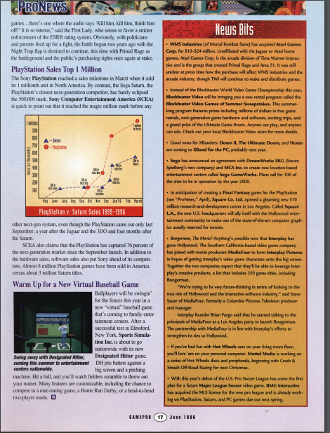 Unfortunately for Sega, It’s only goes down hill from here – even if the Saturn’s performance in the US isn’t as bad as reputation would have you think. The Saturn’s surprise early launch is often presented as one of the reasons for its failure, but it was successful to the point of the company lacking the machines needed to meet demand. The exact number of sales are hard to ascertain (thanks to Sony and Sega both apparently inflating early numbers for PR purposes), but by mid 1996 it looks like the Saturn had sold 500,000 consoles and 3,000,000 games. These figures didn’t look as impressive next to the 1 million consoles and 8 million games supposedly shifted by Sony, but they show that the console had steady sales with a reasonable attach rate.