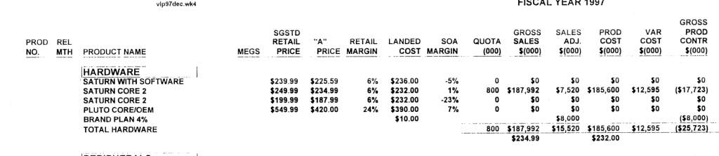 The recent (and highly dramatic) leak of documents and emails surrounding Sega of America’s 1997FY marketing plan adds some important context to the question of how much the Saturn cost Sega. One particularly juicy little nugget is this snapshot of Sega of America’s margins on the Saturn from around March 1996: