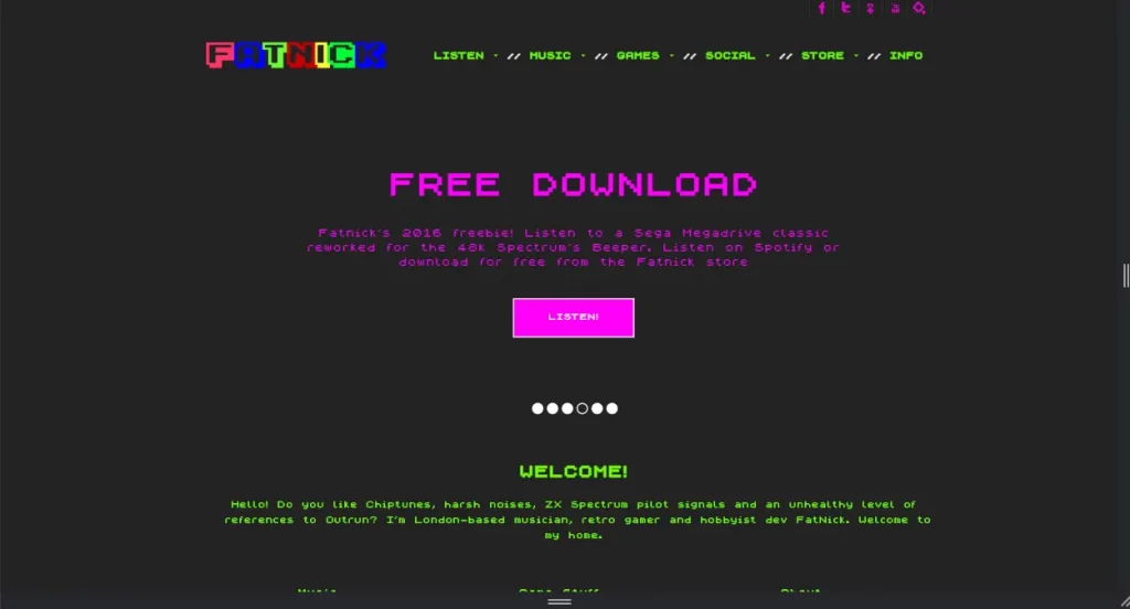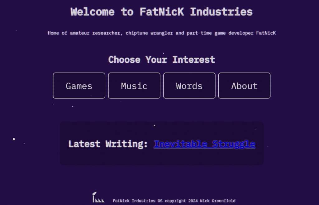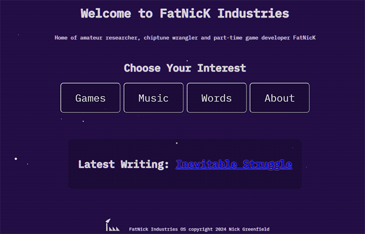 The result is the new FatNicK Industries: a responsive-single page site designed to make your state of the art computer or mobile look like it’s running an OS on an old CRT monitor: the scan line effect is generated via a gradient placed on a before element covering the entire screen, while the flickering is caused by a transparent, white rectangle which sits over the entire monitor and switches between being slightly more and slightly less opaque (this flickering can be switched off from the cookie options page because i didn’t want to give anyone a migraine or a seizure.) The new site contains all of my game experiments, all of my music releases and a viewer page for this blog as well. In the long run i want to make all of the games playable on mobile too – even the Megadrive roms.